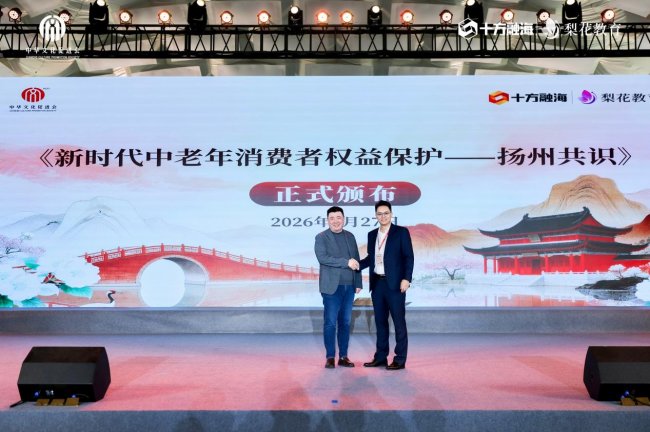 3月27日,中华文化促进会联合十方融海梨花教育于2026首届全民朗诵大会期间正式发布《新时代中老年消费者权益保护——扬州共识》。十方融海副总裁苏涵宣读共识内容,明确规范中老年文化市场秩序,保障中老年群体在教育、文化、艺术等领域的合法权益。